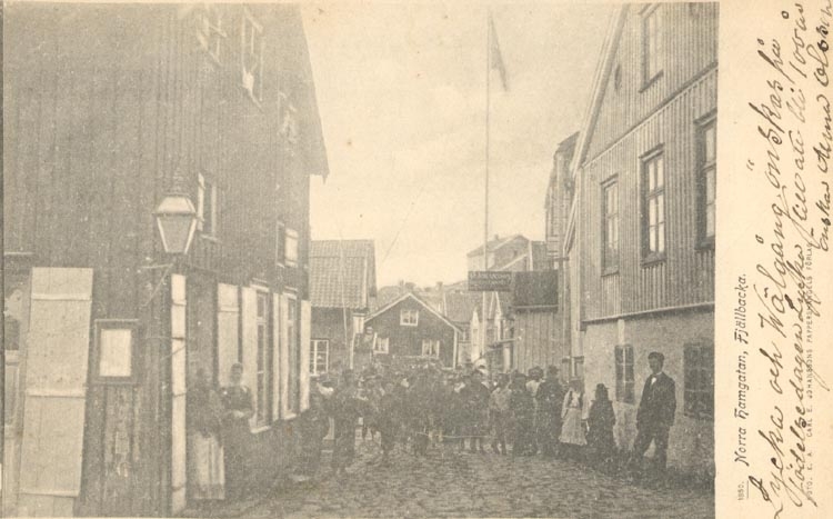 Tryckt text på kortet: "1850 Norra Hamngatan Fjällbacka".
