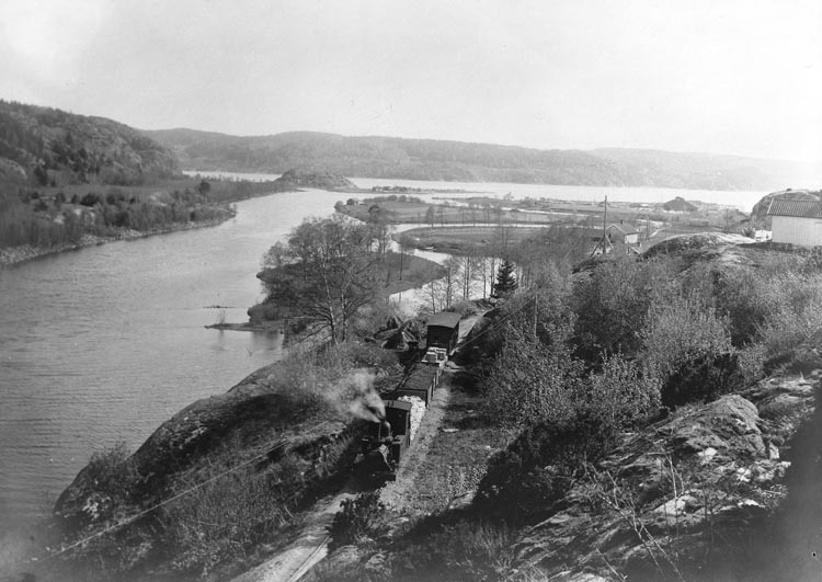 Text som medföljde bilden: "Munkedalståget på uppgående från hamnen till fabriken."