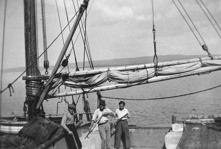 Enl. tidigare noteringar: "Fraktjakten "Ragnhild" lastar is i Hövik sommaren 1947. Personerna på bilden: Kristian Hövik, Jarl Hansson, Sven Niklasson.
