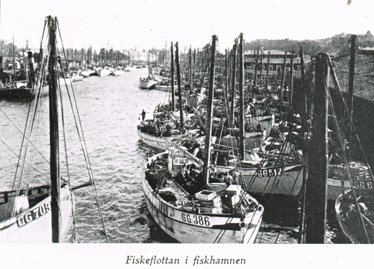 Bildtext på skioptikonplåten: "Fiskeflottan i fiskhamnen."