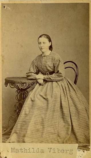 Text på kortets baksida: "Mamsell Mathilda Viberg. Dtr. till Blockmakare V.".