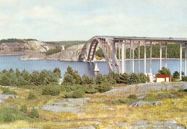 Tryckt text på kortet: "Nya Tjörnbron och Orustleden med Källön och Stenungsön i bakgrunden."