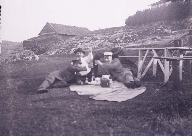 Enligt text som medföljde bilden: "Eric C, Valter och Lundholm vid kaffet 7/7 1901 Kristineberg."