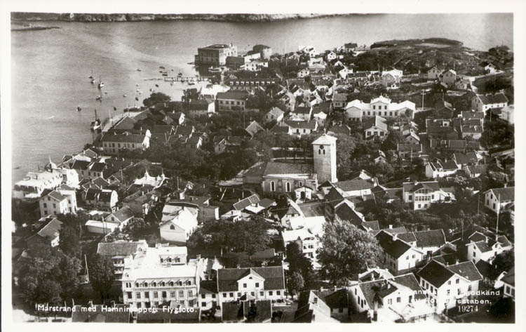 Tryckt text på kortet: "Marstrand med Hamninloppet. Flygfoto."