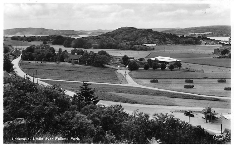 Tryckt text på vykortets framsida: "Uddevalla. Utsikt över Folkets Park."