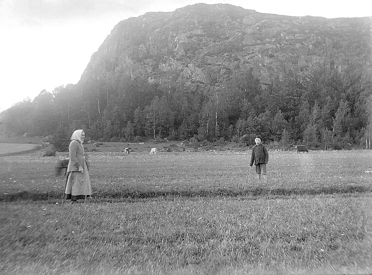Enligt noteringar: "Äldre kvinna och pojke i kohagen."