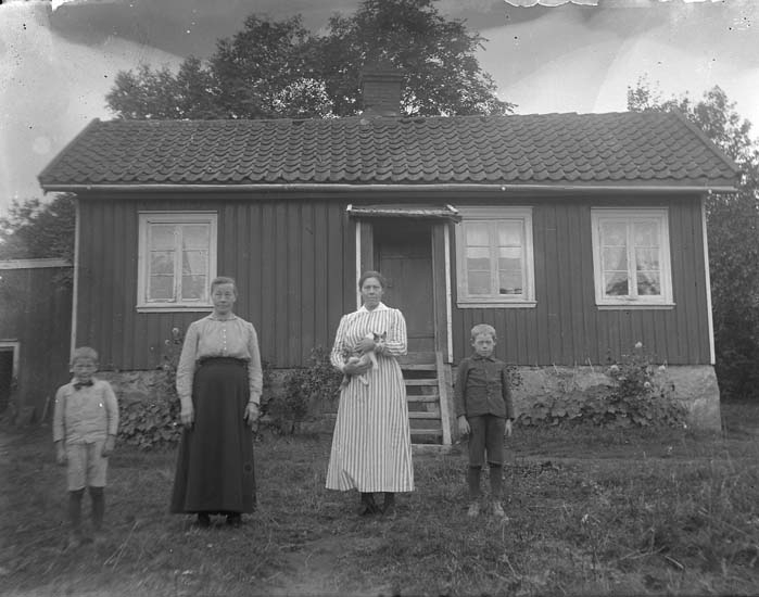 Enligt notering: "Två kvinnor, två barn vid ett hus, Gillberg Vidingen".