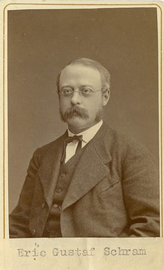 Text på kortets baksida: "Eric Gustaf Schram. 1862-1878 lärare i Geografi och historia, ledare i provårskullen i Upsala 1877-78. Knut Adrian Andersson".