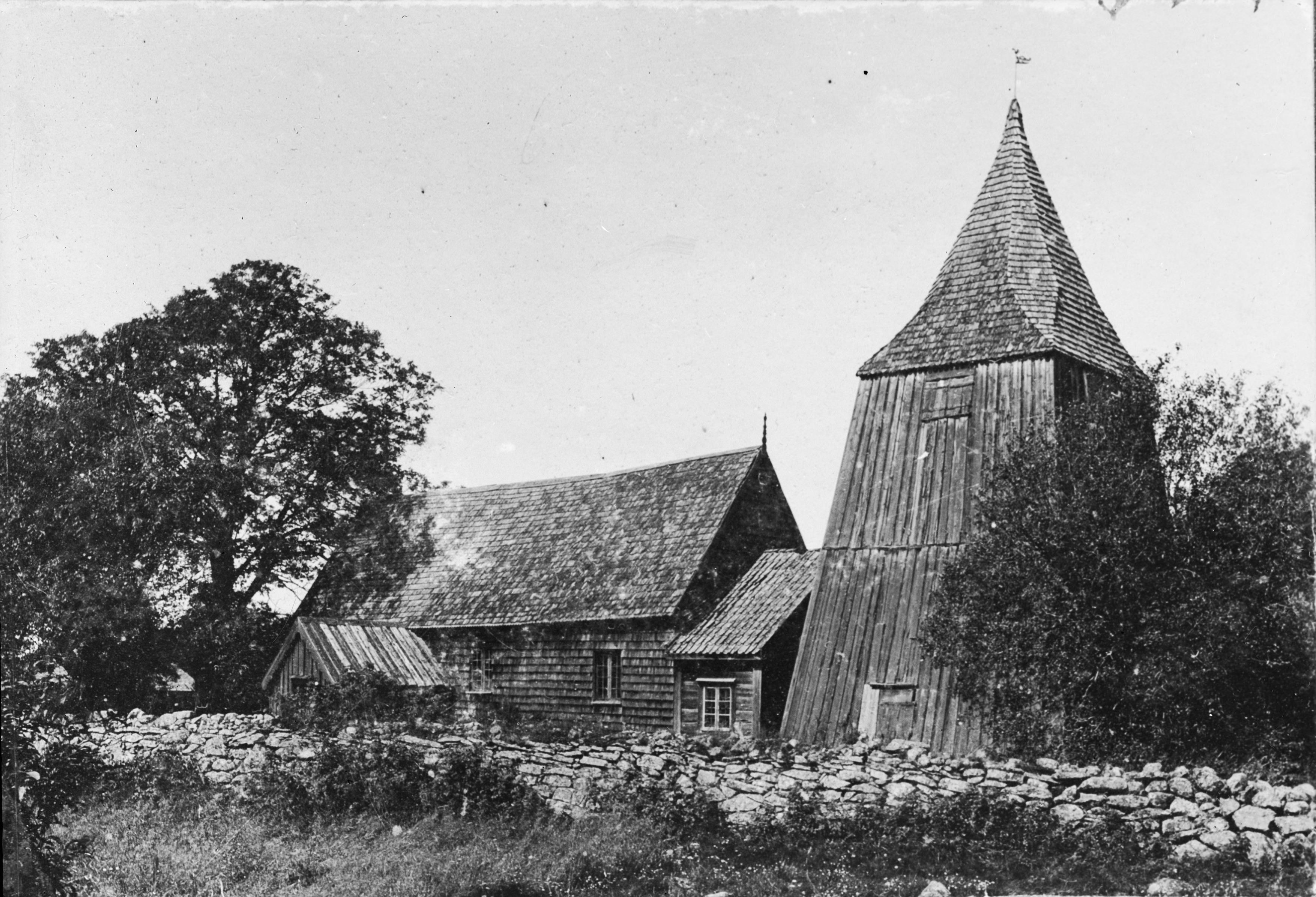Kyrkan och klockstapeln från sydöst.