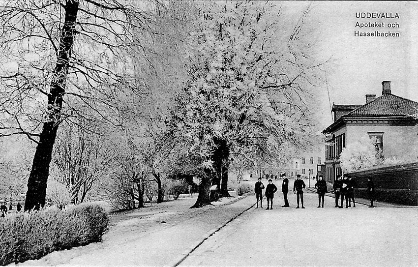 Tryckt text på vykortets framsida: "Uddevalla. Apoteket och Hasselbacken".