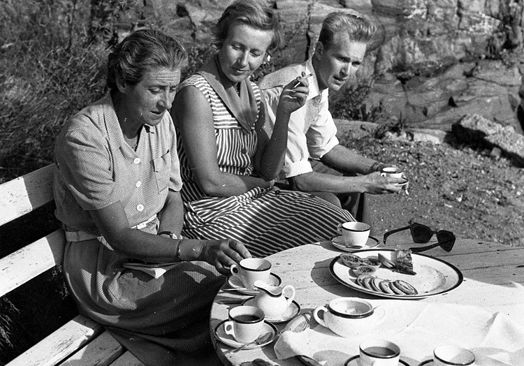 Enligt uppgift: "Ca 1954-1955. Från vänster fru Berta Karlrik (forskare) frun Nils Jerlov och okänd forskare".