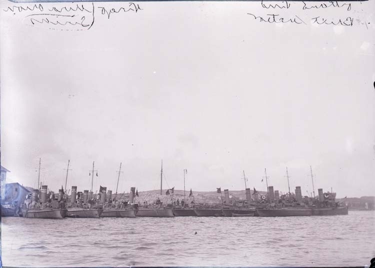 Enligt text som medföljde bilden: "Torpedbåtarna Orkan, Vind, Blixt, Meteor röda. Virgo, Sirius, Mira, Orion hvita Aug 07."