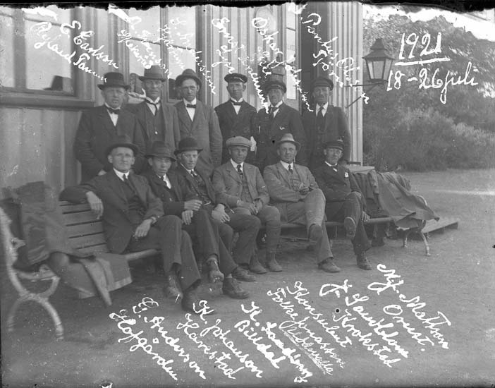 Skrivet på bilden: "1921 18-26 juli. E. Carlsson, Ryland Tanum. A. Svensson, Spekeröd. S. Andersson, Hjärtum. Ernst K...mann,Lyse. Oskar Johansson, Skee. Pontus Olsson, Tjörn. G. Andersson, hofgården. K. Johansson, Harestad. K. Sandberg, Billdal.