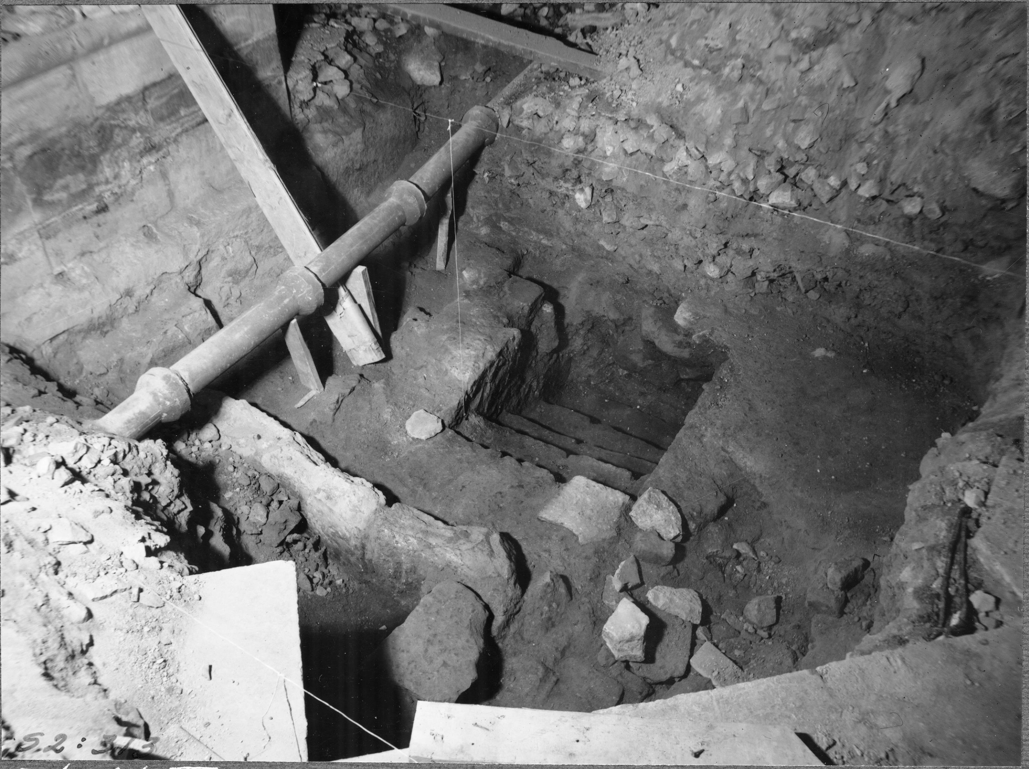 Grävning inom kyrkan, schakt X, krypschakt, norra trappan, från sydväst.