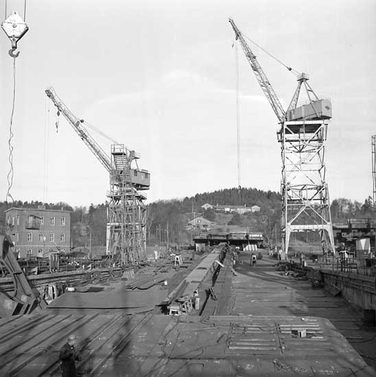 Kölsträckning av 266 M/S Uraljskie Gory. I slänten bakom syns direktörsvillorna och det höga huset till vänster är det gamla gasverket.