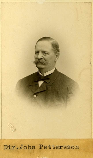 Text på kortets baksida: "Direktör John Pettersson, f. 27/11 1834 d. 9/4 1912. S. F. 1869 1908".