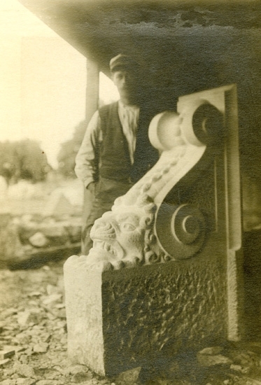 Bildhuggare Reinhold Pettersson på arbetsplatsen med en konsol huggen i sten