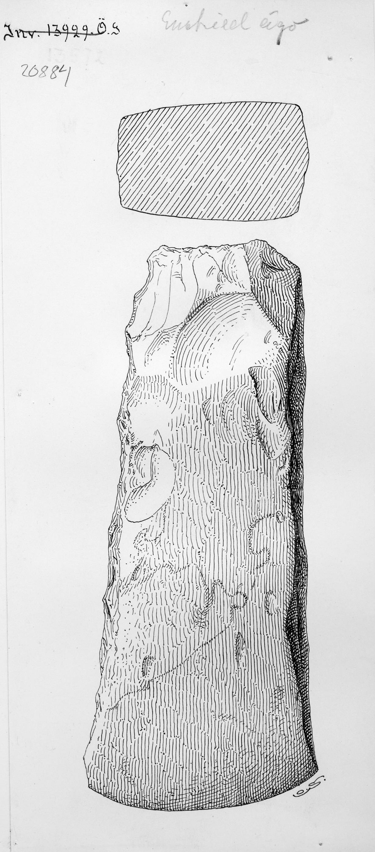 Teckning av tjocknackig flintyxa. Signatur Olof Sörling.