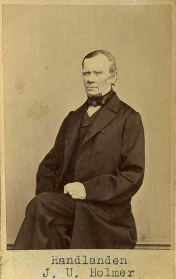 Text på kortets baksida: "Handlanden Johan Ulric Holmer, f.1/11 1792 i Strömstad, fadern provincialläkare, intagen 1805 under no 146 å Gust. Barnhus. Utgick derifrån 1808 till handel, sedan egen handel".