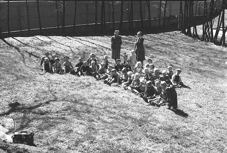 En förskolegrupp sitter i en grässlänt med sina två lärare.