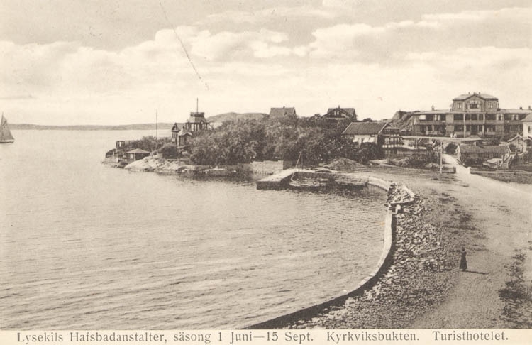 Tryckt text på kortet: "Lysekils Hafsbadanstalter, säsong 1 Juni-15 Sept. Kyrkviksbukten. Turisthotellet."
