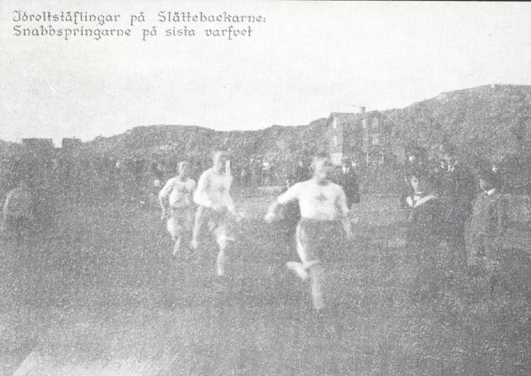 Tryckt text på kortet: "Idrottstäflingar på Slättebackarna. Snabbspringarna på sista varfvet.."