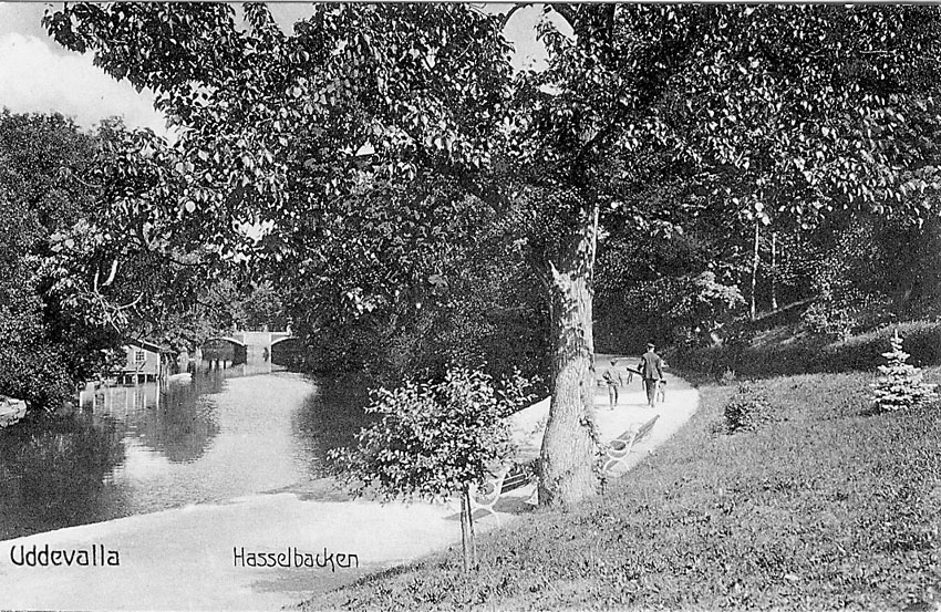 Tryckt text på vykortets framsida: "Uddevalla. Hasselbacken".
