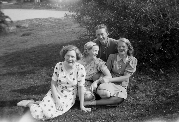Enligt senare noteringar: "Tre kvinnor och en man sittande på en äng. Johan Börjesson-Eld (?) tillsammans med: Valborg Johansson, Elsa Karlsson och Judith Johansson."