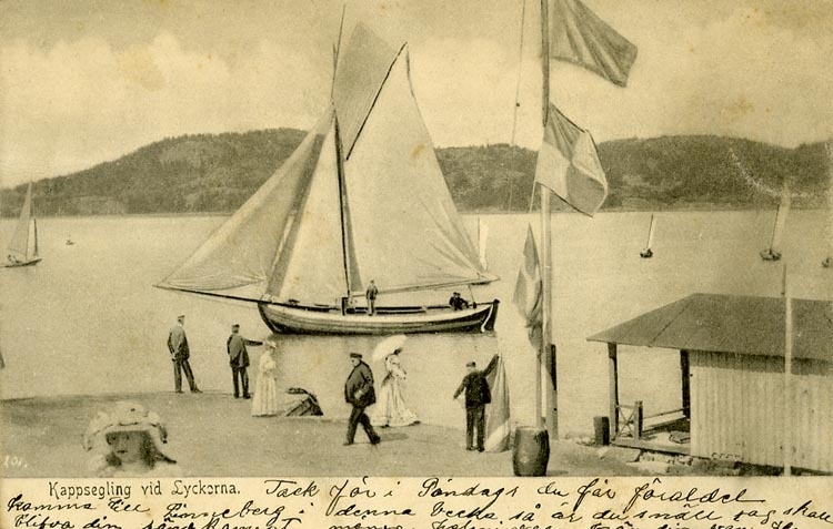 Enligt Bengt Lundins noteringar: "Kappsegling vid Lyckorna. Flaggspel".
