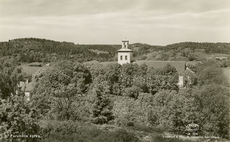 Enligt Bengt Lundins noteringar: "Forshälla kyrka och prästgårdenbland träden".