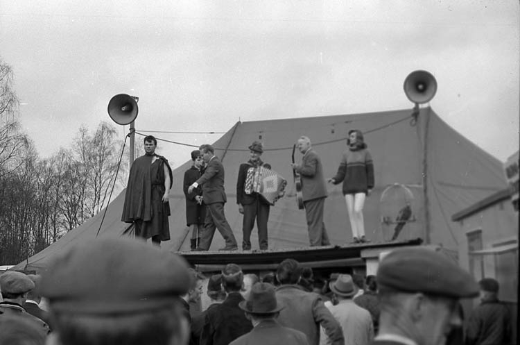 Text till bilden:"Två populära spelmän på Rabbalshede marknad 1964, "Västgöta-Sigge" och Johan Edvardsson eller "Glade pelle". Samhör med bild 37 i album 3.