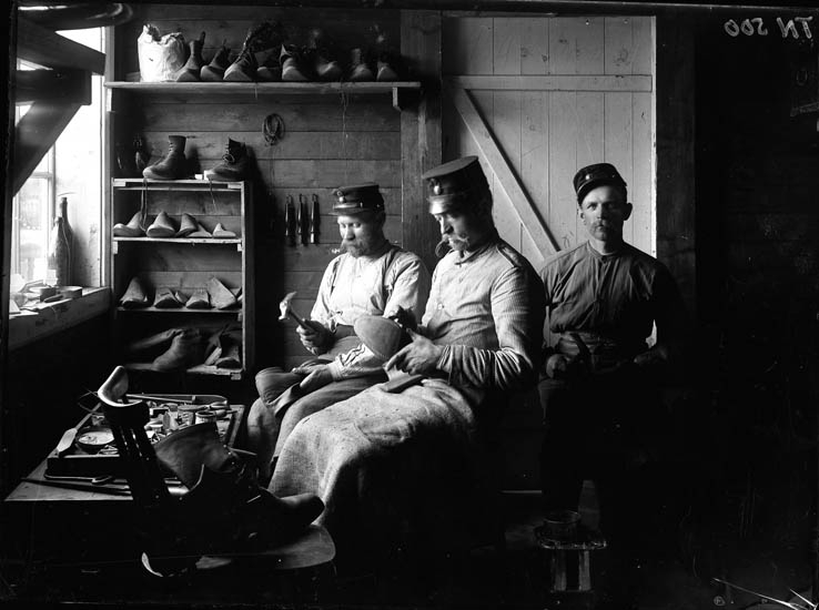 Enligt tidigare noteringar: "Interiör från skomakeriverkstaden på bohusläns regemente Uddevalla. Tre Skomakare."