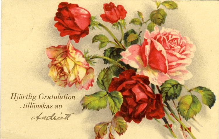 Notering på kortet: Hjärtlig Gratulation tillönskas av Andriett.