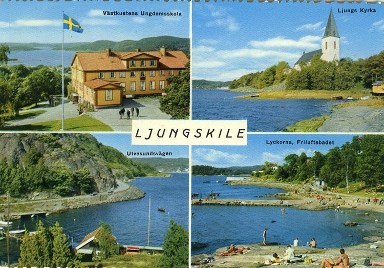 Enligt Bengt Lundins noteringar: "Ljungskile. 4-Bild. Västkustens Ungdomsskola. Ljungs Kyrka. Ulvesundsvägen. Lyckorna, Friluftsbadet".