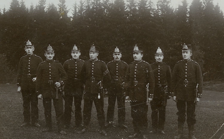 Enligt Bengt Lundins noteringar: "Gruppbild. Åtta man vid skogsbrynet".