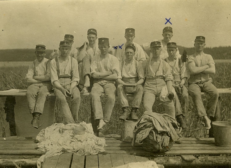Enligt Bengt Lundins noteringar: "Backamo. Tvättpaus vid bryggan. X) Georg Tingberg. XX) Artur Holmius".