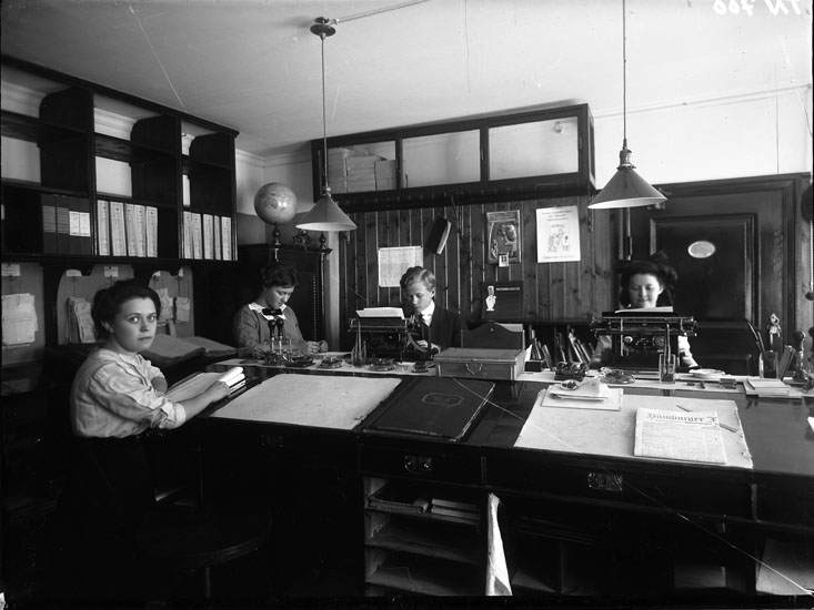 "Kontorsinteriör med kontorspersonal vid skrivmaskiner och pulpeter. Edw. Schlaugs, Eskilstunaboden" enligt notering.