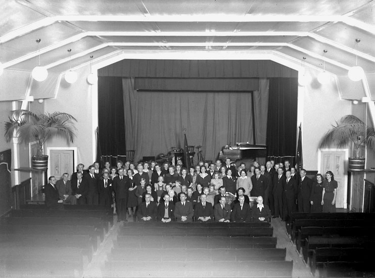 Enligt noteringar: "Grupp föreningsmedlemmar i Folkets Hus A-sal i samband med någon fest. Musikinstrument på scenen." (BJ)