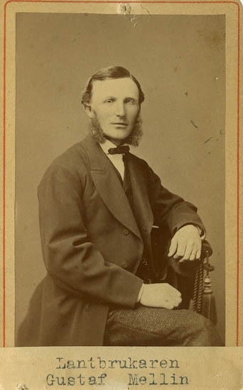 Text på kortets baksida: "Lantbrukaren Gustaf Mellin Hälle, Bohuslän. Född 1840".