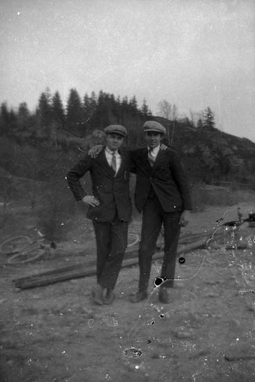 Enligt notering: "Två kamrater poserar. Torsten i Huud, Sven Andersson Trättestad, (präst)".