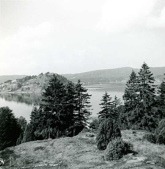 Sommaren 1959. Utsikt från tomten över Högholmen. Till vänster utanför bilden Wetterlunds hus. På denna tid fanns det färja över till Vindön. Det fanns bageri vid färjeläget, på lördagarna var det lång kö med bilar som ville över.