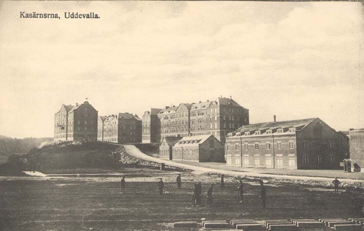 Tryckt text på kortet: "Uddevalla. Kasärnerna."