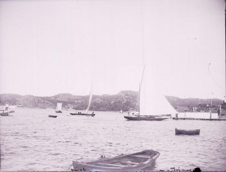 Enligt text som medföljde bilden: "Gustavsberg, kappsegling "Trollhättan" eg. H. Dahlen o Isis lägga till vid bojarne 30/7 1899".