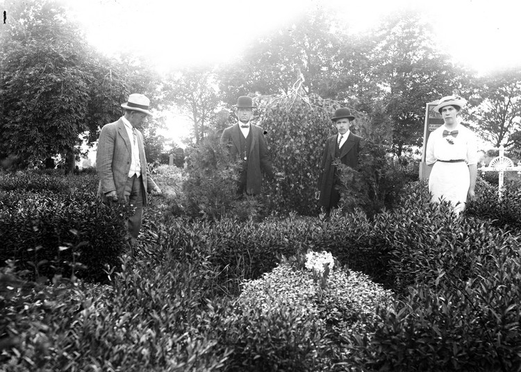 Fyra personer som besöker en grav troligen på Foss kyrkogård