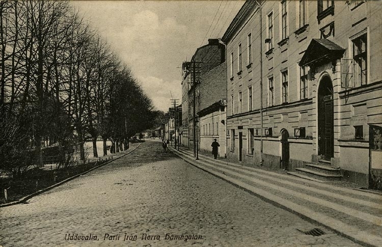 Tryckt text på vykortets framsida: "Parti från Norra Hamngatan."