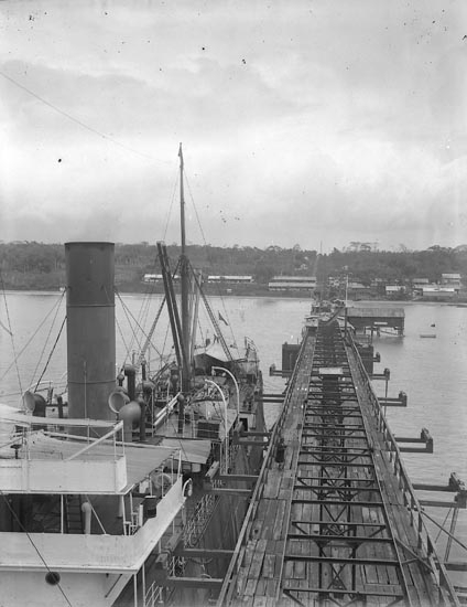 Fotografens notering: "La Brea Beck sjö-pier. Tunnan fyllda med beck kommer från höjden i bakgrunden, vänstra sida, och när de är midt öfver rännan, lämnar de, becket är lämpat ombord, och tunnan fortsätter sin väg och upp på andra sidan".