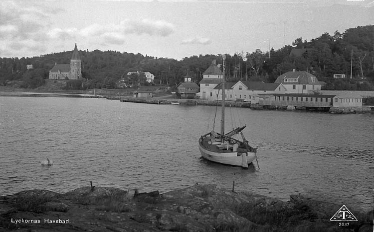 Enligt Bengt Lundins noteringar: "Lyckorna. Havsbad / Kyrka - Kallbadhus. Vykort TF 2037 Foto BL 281 d".