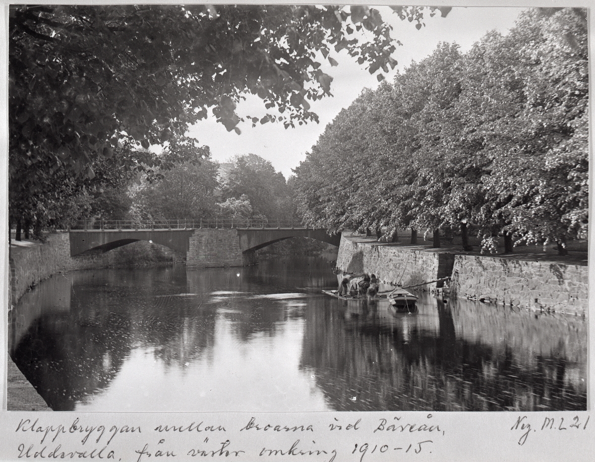 Text på kortet: "Klappbryggan mellan broarna vid Bäveån, Uddevalla, från väster omkring 1910-15".