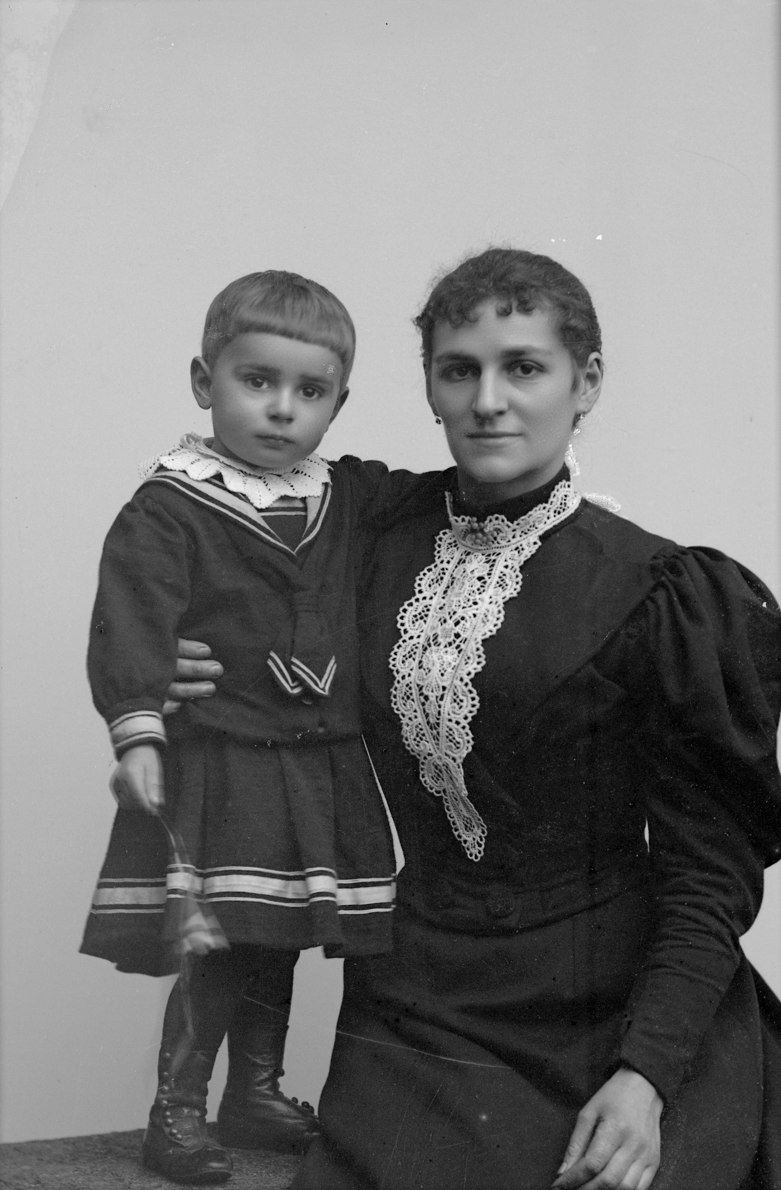 Beskrivning: Porträtt i helfigur av fru Merkalls med son.