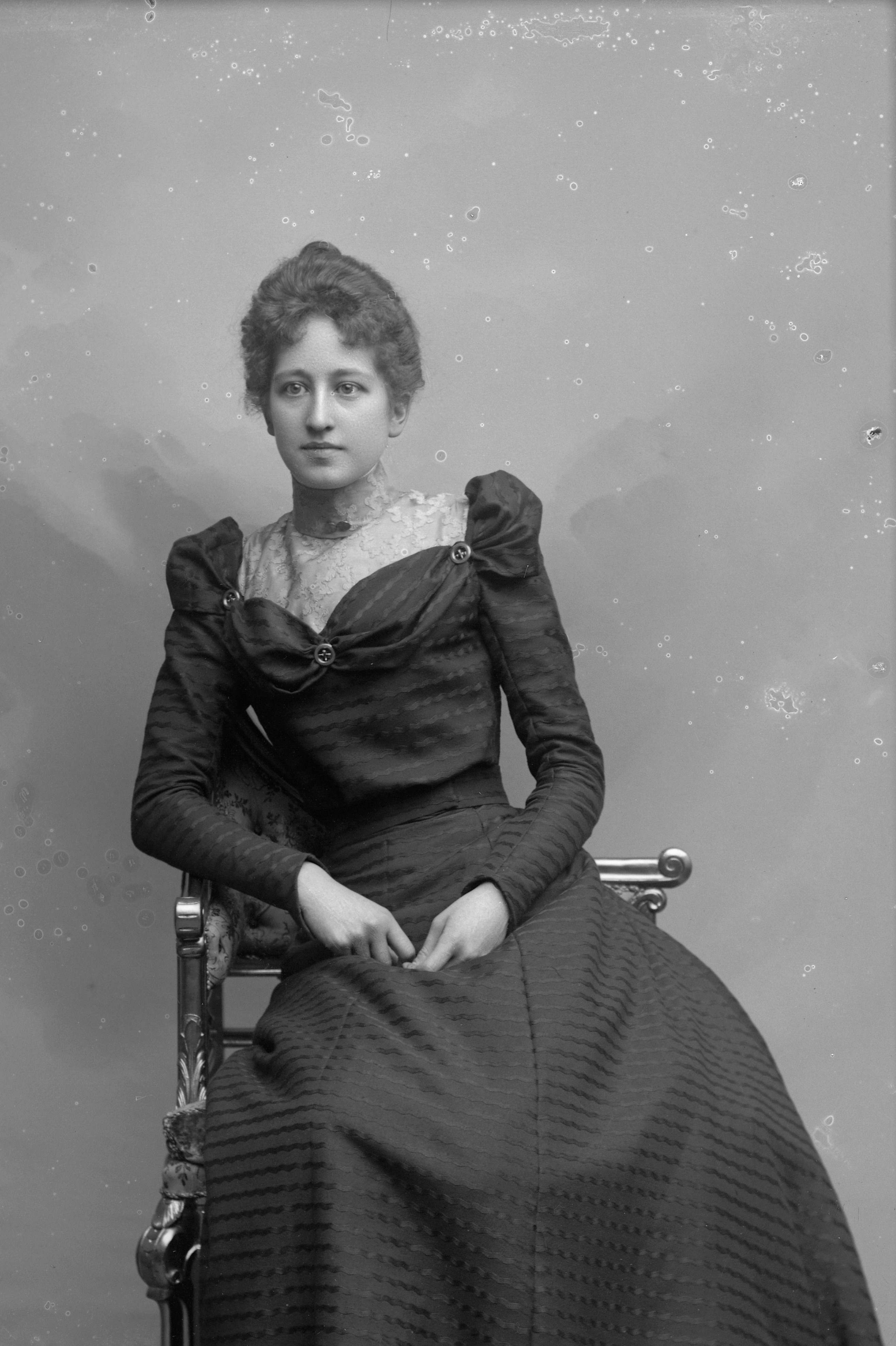 Porträtt i helfigur av fröken Enander, sittande i stol.